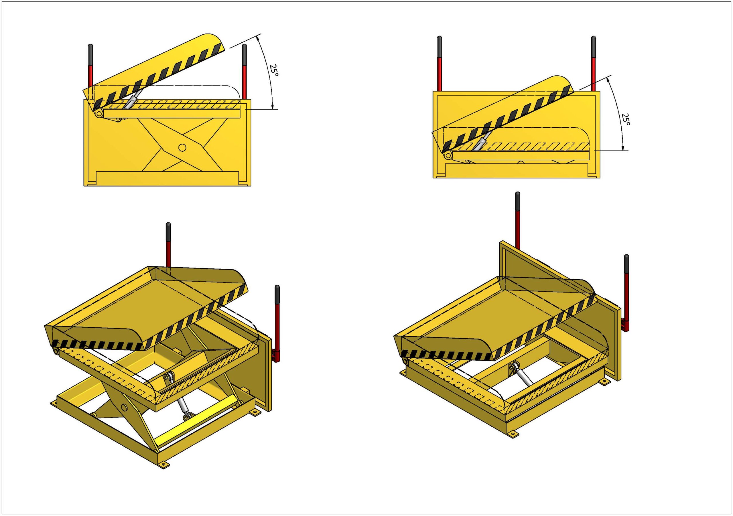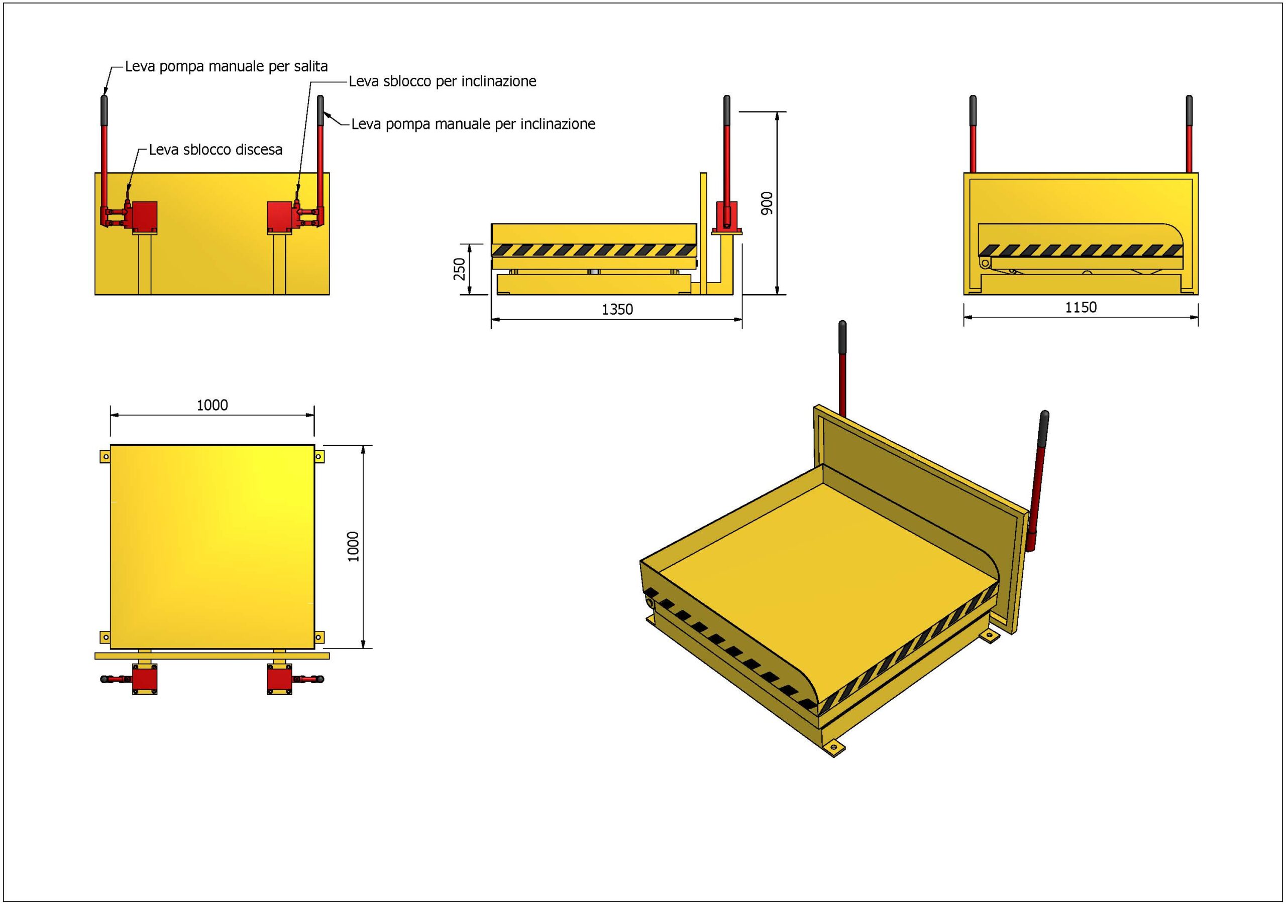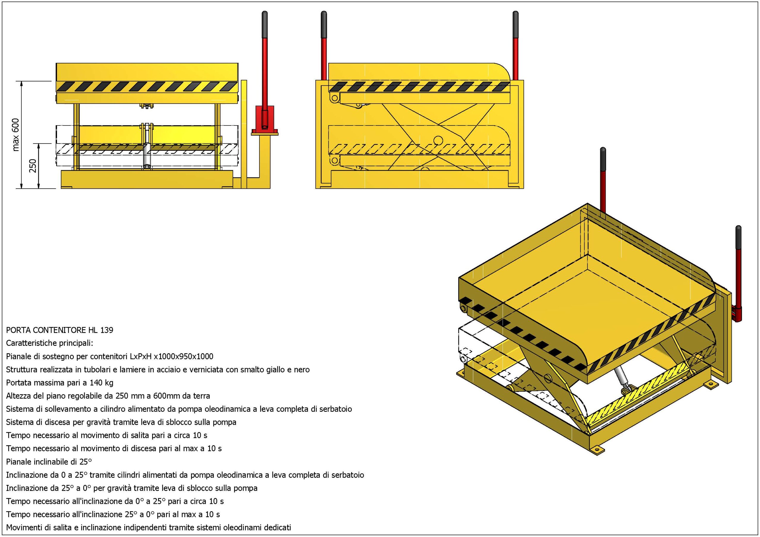 Altezza del piano regolabile da 250 mm a 600mm da terra. Pianale di sostegno per contenitori LxPxH x1000x950x1000. Portata massima pari a 140 kg. Ha un sistema di discesa per gravità tramite leva di sblocco sulla pompa, mentre il sistema di sollevamento a cilindro è alimentato da pompa oleodinamica a leva completa di serbatoio. La struttura, realizzata in tubolari e lamiere in acciaio e verniciata con smalto giallo e nero, consente una buona solidità e, nel contempo, una buona duttilità.